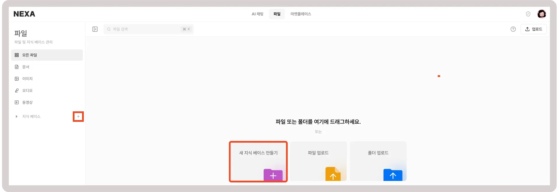 좌측 사이드바의 "지식 베이스" 섹션에서 + 아이콘을 클릭하거나,