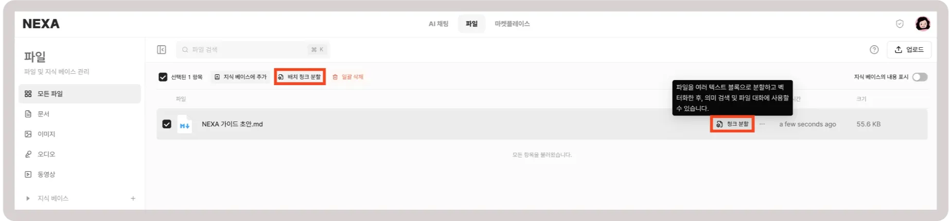 특정 문서에 마우스를 올려 “청크 분할” 버튼을 선택합니다.