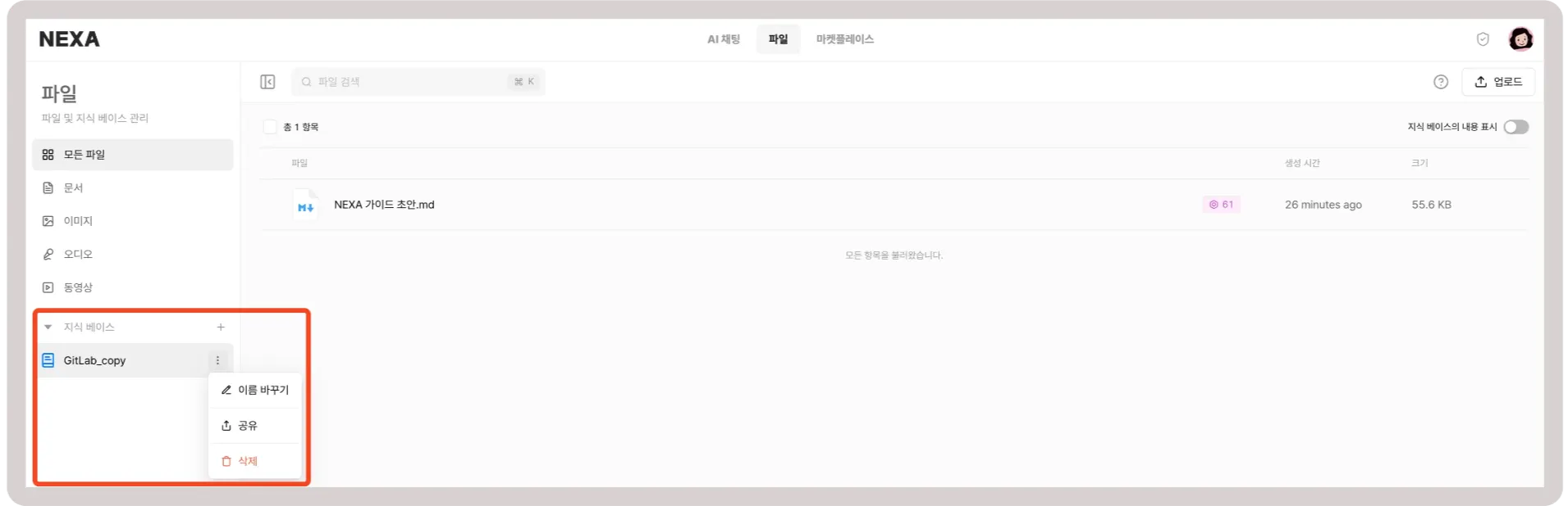 좌측 사이드바에서 특정 지식 베이스의 오른쪽에 ‘더보기(⋮)’ 아이콘을 클릭한 후