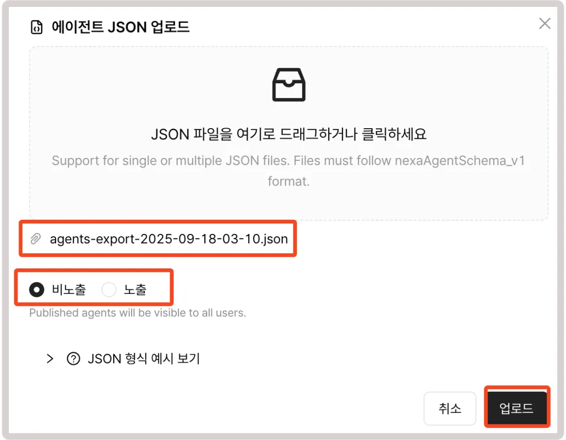 “에이전트 JSON 업로드” 버튼을 클릭하면 모달이 열립니다.
