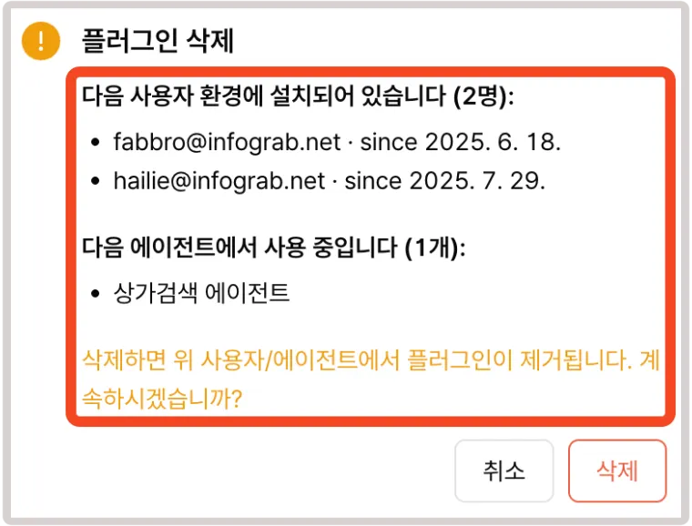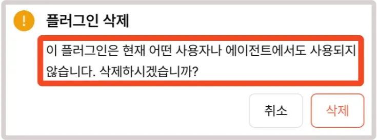 경고 메시지 내에서 한 번 더 “삭제” 버튼을 클릭하면 MCP 서버가 삭제되며, 관리자 화면과 마켓플레이스에서 모두 제거됩니다.