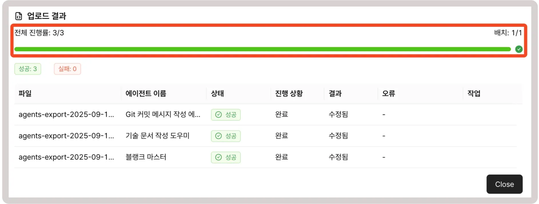 업로드 진행 화면에서 JSON에 등록된 에이전트가 적절히 분할되어 처리되는 것을 확인할 수 있습니다. 모든 작업이 완료되면 상태가 “성공”으로 표시됩니다.