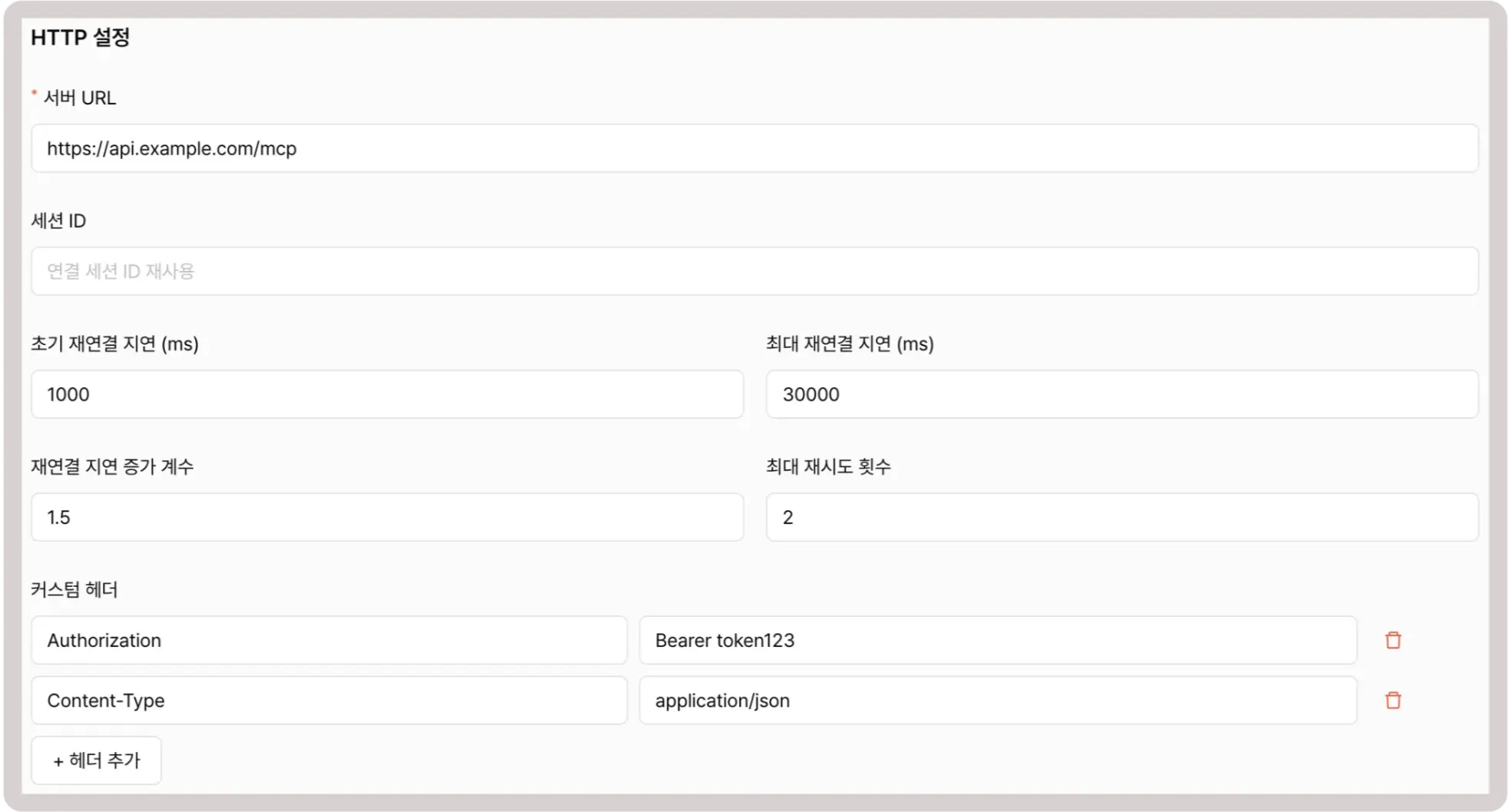 “MCP 서버 추가하기” 버튼을 클릭하여 새로운 MCP 서버를 연결, 구성할 수 있습니다.